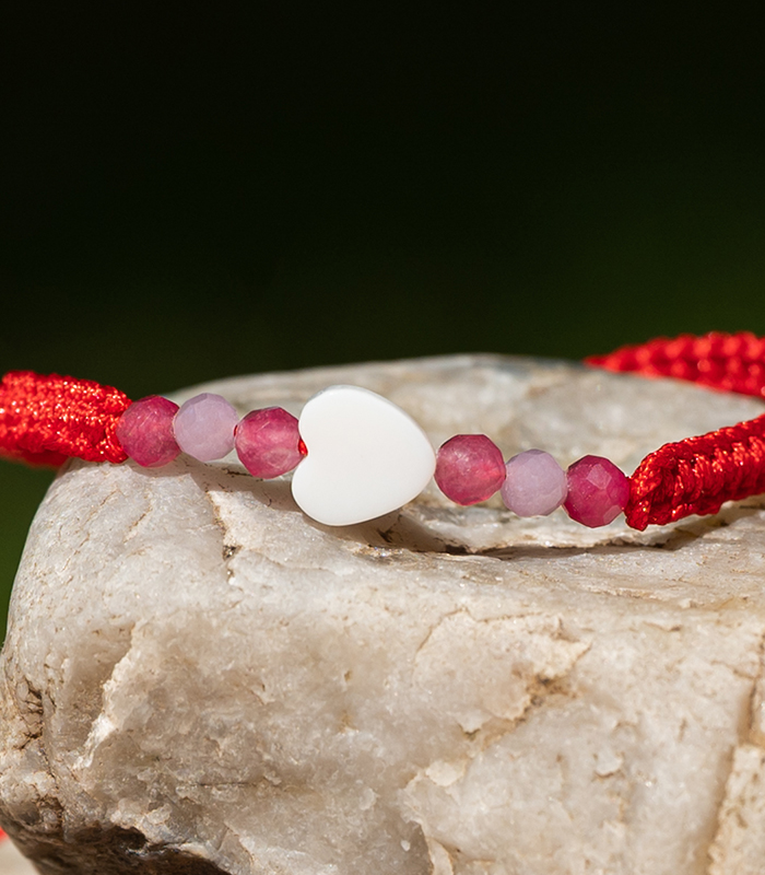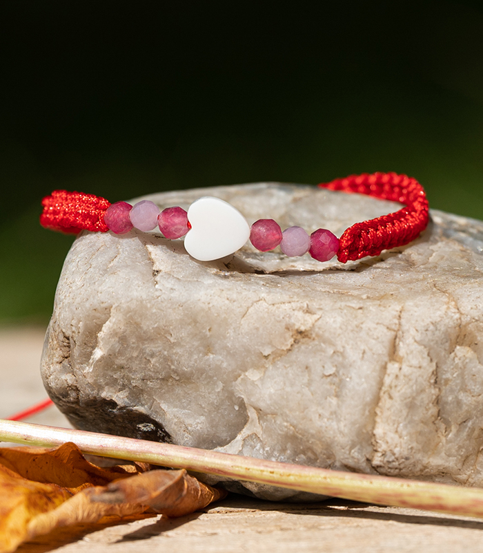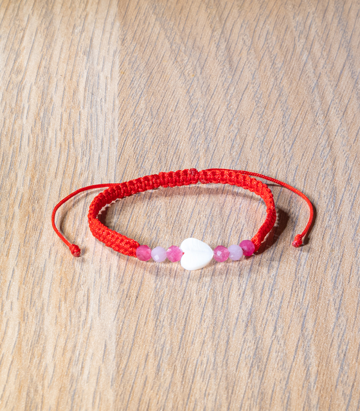 Dětský minerální Shamballa náramek s růžovým chalcedonem a perleťovým srdíčkem – jemný a hravý šperk, který spojuje nádhernou pastelovou barvu s přírodní energií.